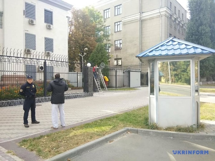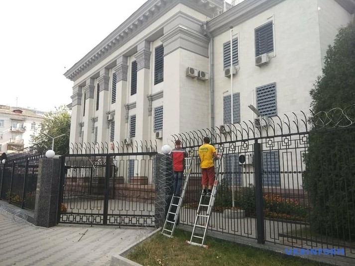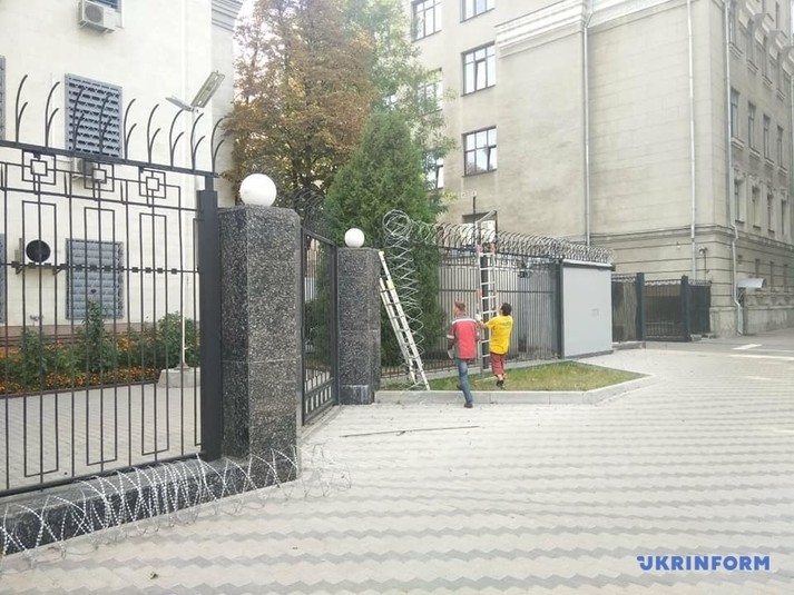 Раніше в ЗМІ повідомлялося, що вранці 23 липня з посольства Росії на Повітрофлотському проспекті в Києві зникла велика частина колючого дроту.