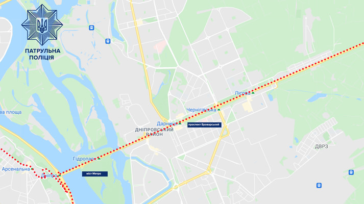 - проспект Броварський (від мосту Метро до повороту в напрямку села Зазим‘я)