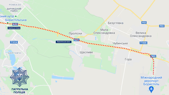 - Бориспільське шосе (від міжнародного аеропорту «Бориспіль» до Харківської площі)