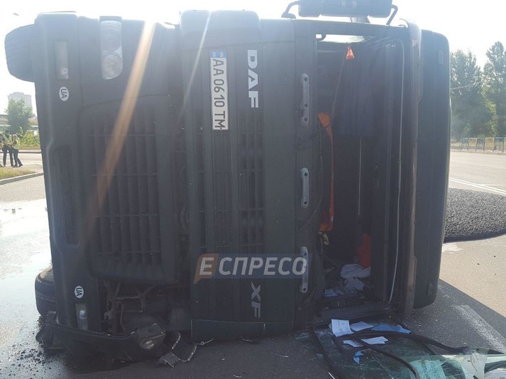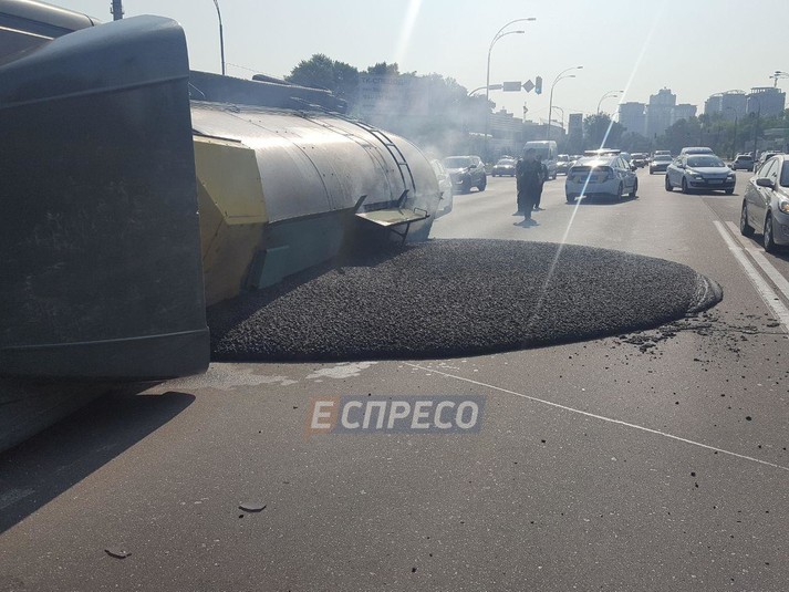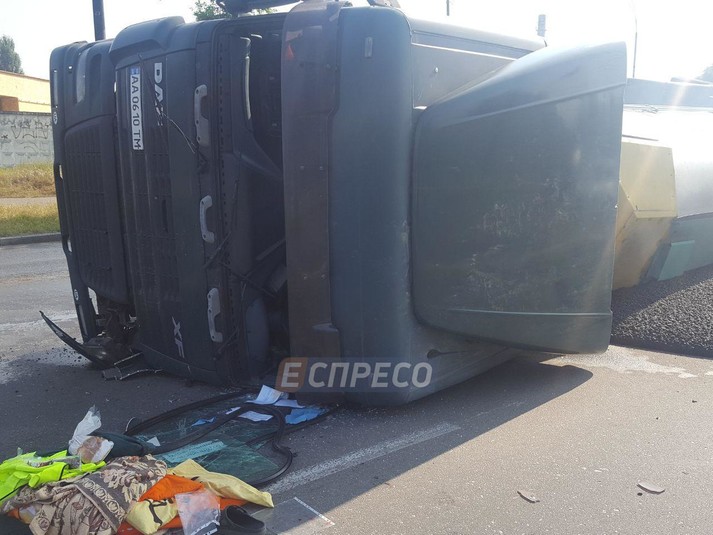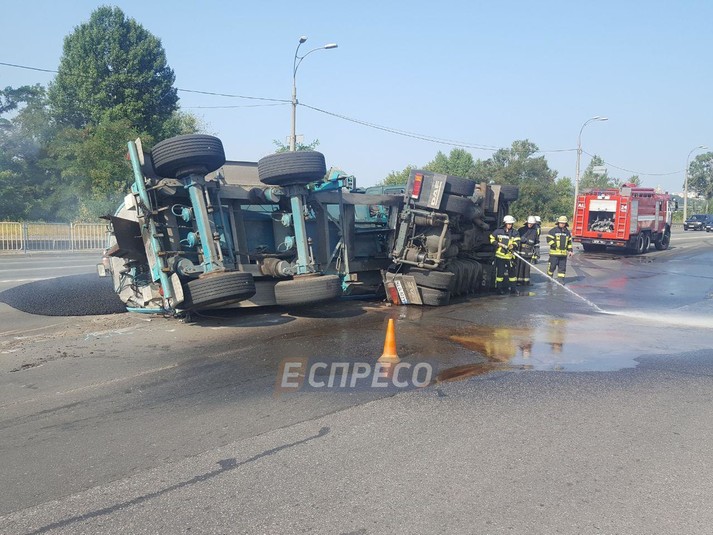 Інцидент стався на перехресті Дніпровської набережної та вулиці Здолбунівської. Водій багатотонника перевозив асфальт на будівництво Подільсько-Воскресенського мосту і в якийсь момент не впорався з керуванням, у результаті чого фура впала на бік.
