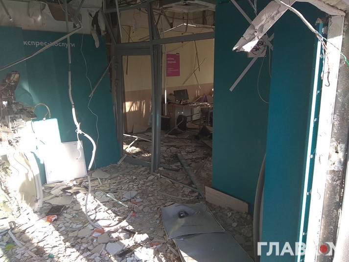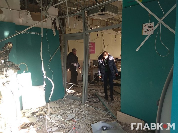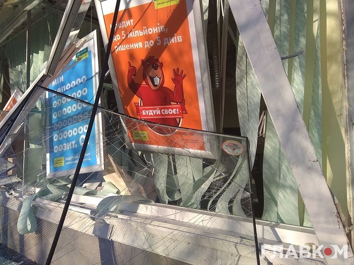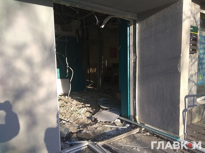 При цьому скляна вітрина вилетіла назовні, а у самому відділенні впала на підлогу стеля.