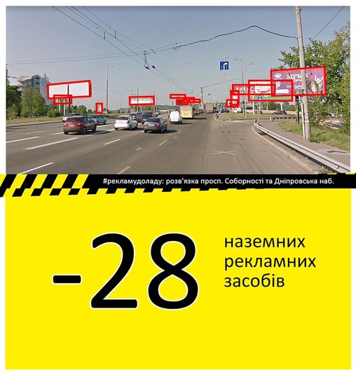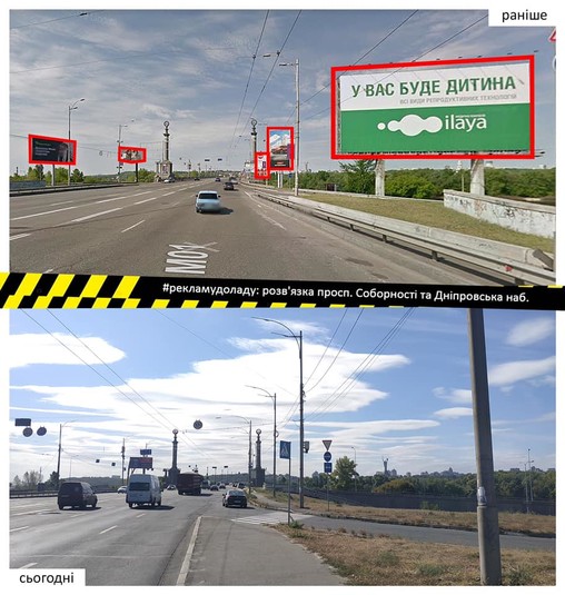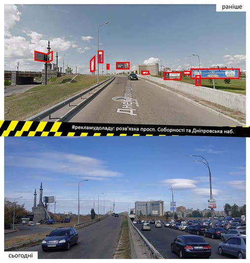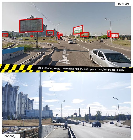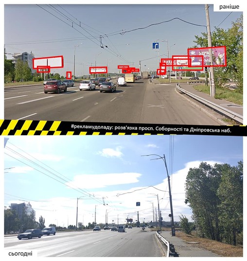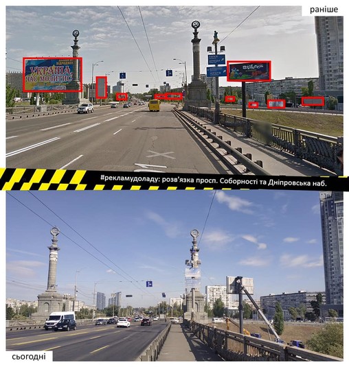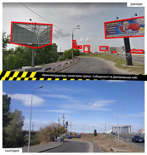«28 одним махом! Пам’ятаєте демонтаж на мосту Патона? Той, де з правобережної розв’язки «безслідно зникли» 90 рекламних конструкцій. Мабуть, забули, адже до хорошого звикаєш швидко. Пропоную забути про рекламу і на лівобережному під’їзді до мосту Патона. На цьому місці відтепер лише зелені газони і хвилі Дніпра», - повідомив Олександр Смирнов.