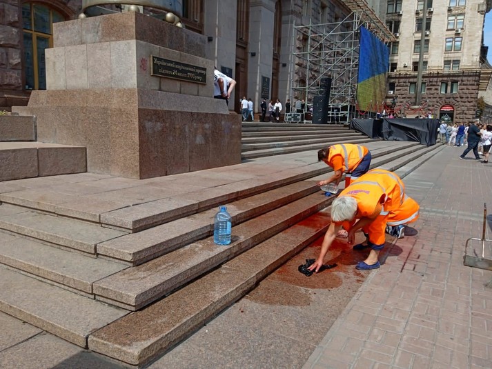 Після завершення офіційних святкових заходів до 30-річчя незалежності України на вул. Хрещатик невідомий чоловік облив червоною фарбою сходи біля Київської міської державної адміністрації (КМДА). Про це повідомляє пресслужба КМДА.