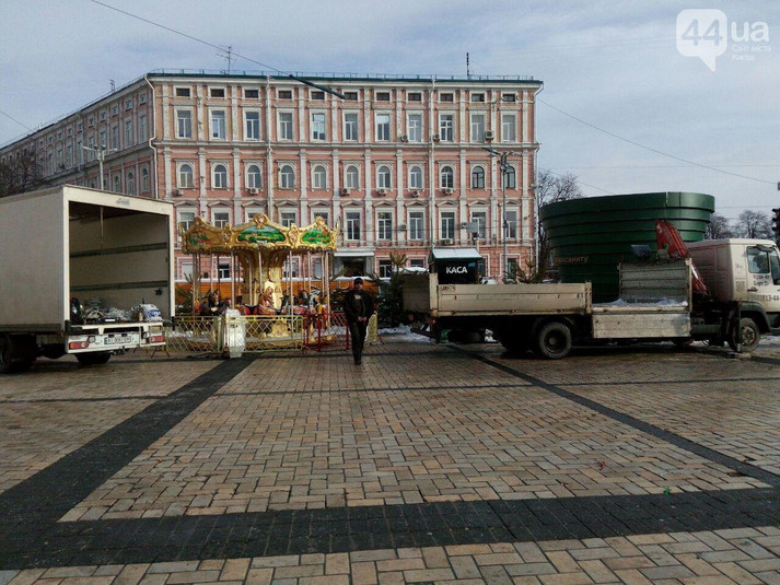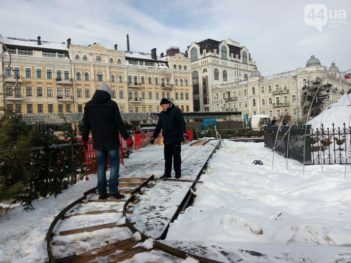 Крім ялинки, зараз ведуться демонтажні роботи на всій площі. Так, будиночки з фуд-кортом вже закриті, а святкового потяга біля пам'ятника Б. Хмельницькому більше не знайти. Також фахівці займаються демонтажем сцени і всього устаткування.