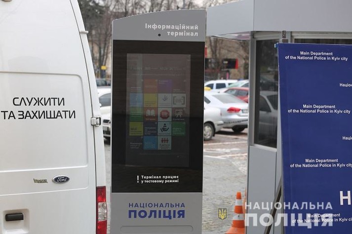 Перший інформаційний термінал уже запрацював у тестовому режимі біля входу до Головного управління Національної поліції у Києві, а в подальшому ще два таких комунікатори будуть налаштовані у Шевченківському та Голосіївському управліннях столичної поліції.