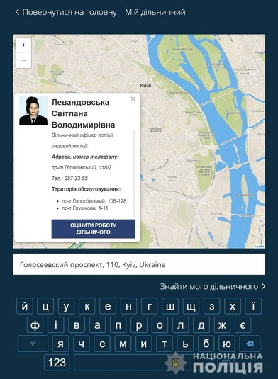 Крім того, використовуючи інтерактивну мапу, можна буде визначити адресу та контактні дані свого дільничного офіцера поліції, повідомити про випадки корупції відповідальним підрозділам, дізнатися статистичні дані, а також отримати корисну інформацію правозахисних громадських організацій.