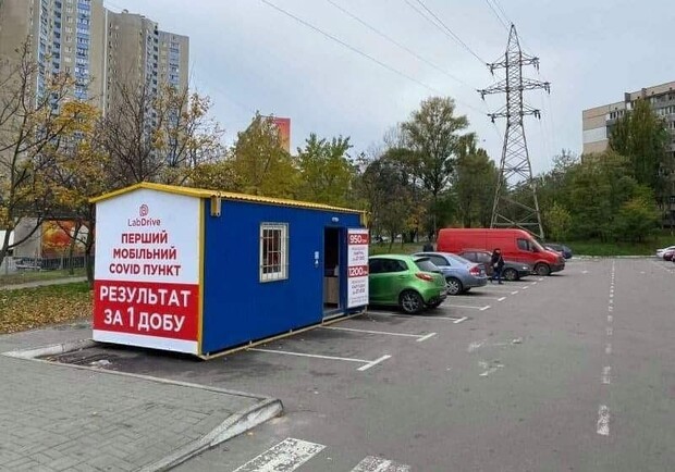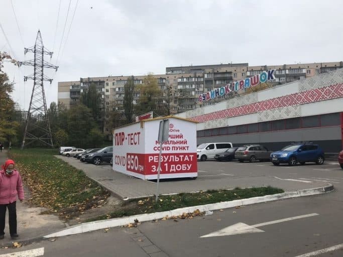 На проспекті Правди, 58 в Києві невідома компанія відкрила мобільний пункт з тестування на коронавірус.