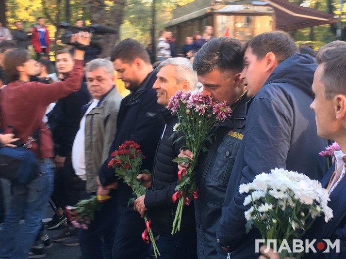 Присутні тримають прапори ВО «Свобода», ОУН, організації «Сокіл», Національного корпусу.
