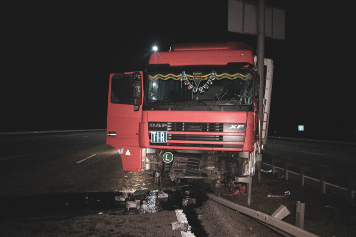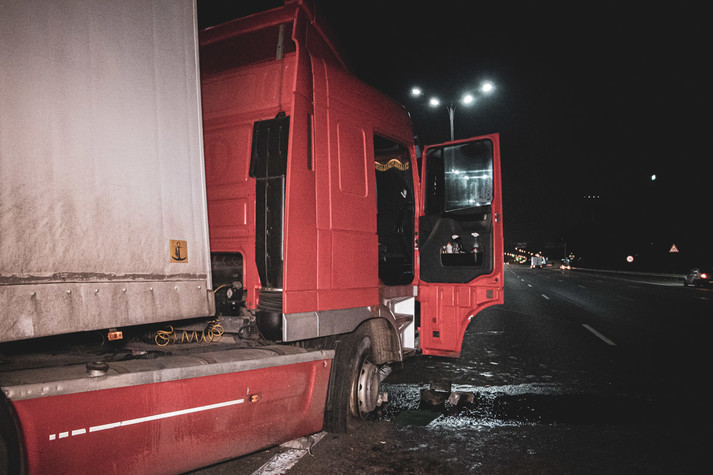У ніч на понеділок, 2 березня, на Бориспільському шосе в Києві у ДТП потрапила навантажена фура: DAF з'їхав з дороги, зніс близько десяти метрів відбійника і врізався в стовп.