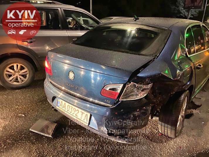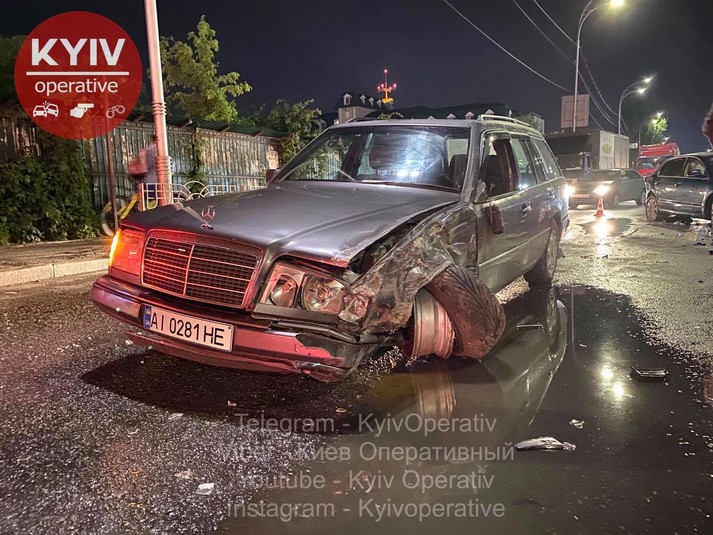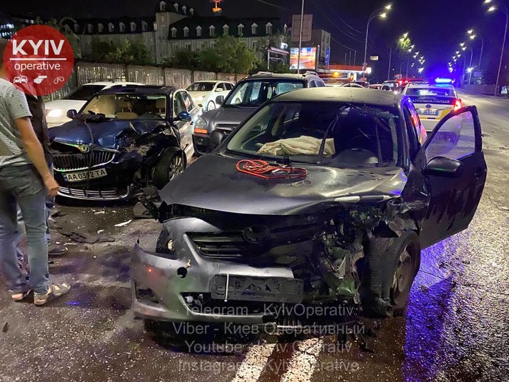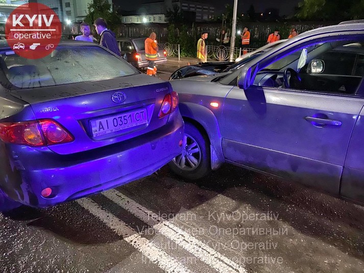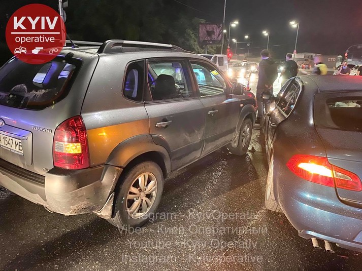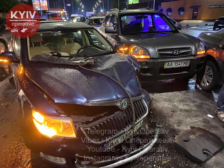 «Skoda, Mercedes та Hyundai рухалися в одному напрямку - у бік Поштової площі. Зненацька на їх смугу вискочив водій на Toyota, який їхав у напрямку Почайної назустріч трьом авто вказаним вище. Toyota б‘є Skoda, Skoda відлітає у Mercedes. Після зіткнення автомобіль Toyota розвернуло на 180 градусів і відкинуло у Hyundai», - повідомляє «Київ оперативний» у Facebook.