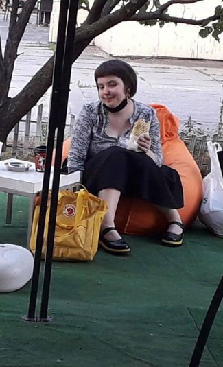 Була одягнена: у сіро-блакитну кофтину, довгу чорну спідницю, при собі мала яскравий жовтий рюкзак.