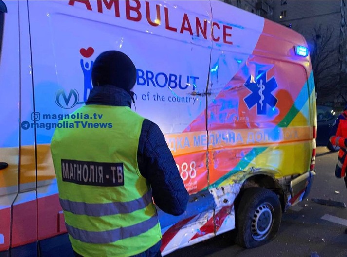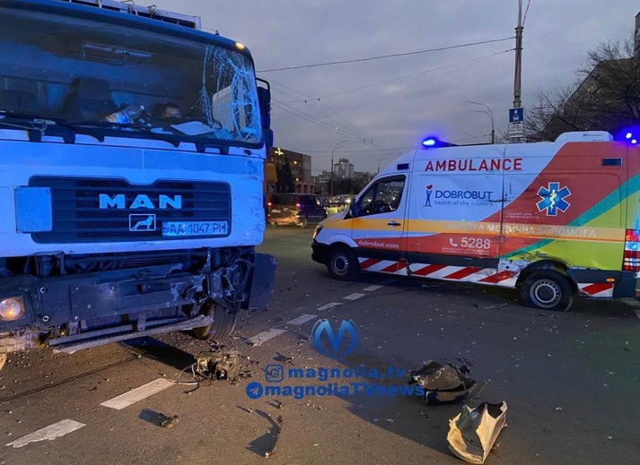 Як вдалося з’ясувати, «швидка» їхала на виклик у напрямку Троєщини, водій увімкнув проблискові маячки та звуковий сигнал. Потік машин зупинився, аби пропустити медиків, які рухалися на червоний сигнал світлофора. Натомість водій вантажівки MAN (сміттєвоз) не надав перевагу у русі спецтранспорту та протаранив автомобіль «швидкої». Від сильного удару машину медичної допомоги відкинуло у позашляховик Lexus.