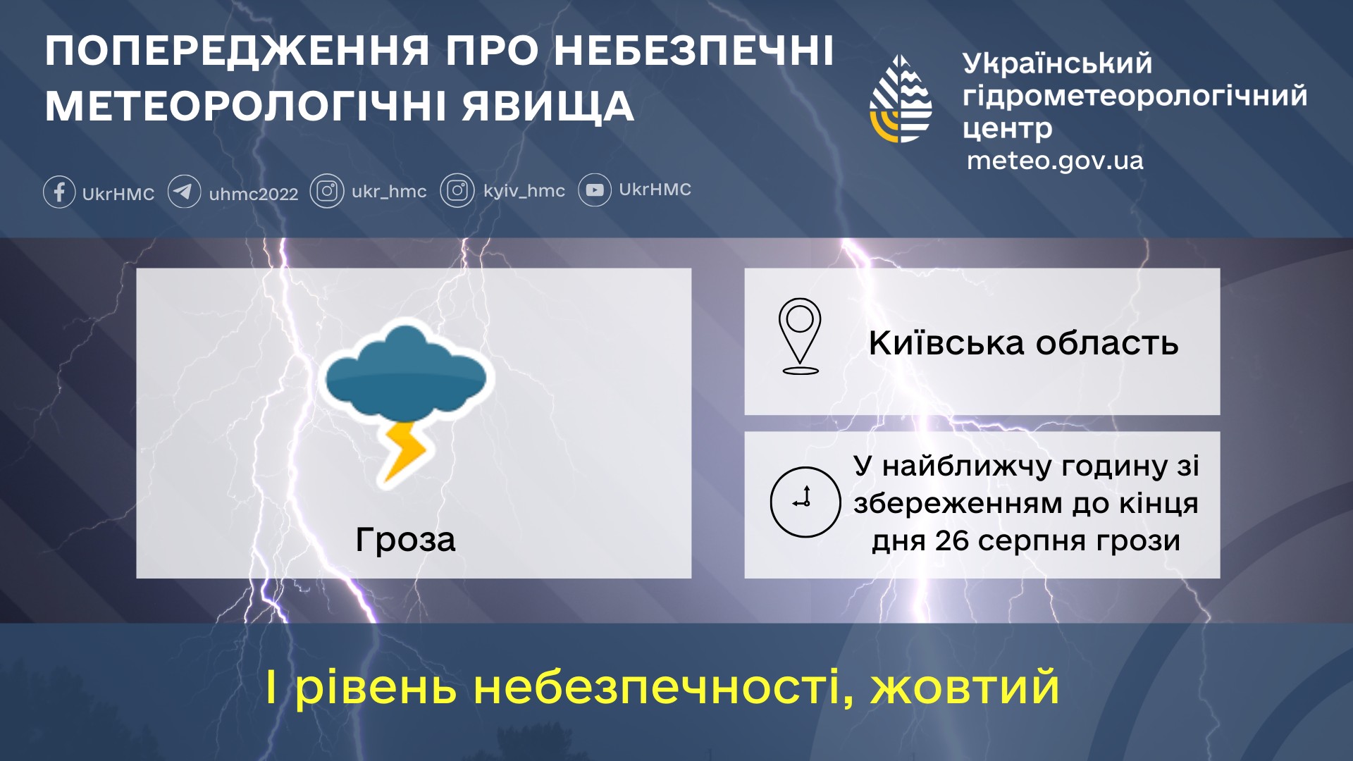 Згідно з повідомленням, у найближчу годину зі збереженням до кінця дня 26 серпня на території Київщини очікуються грози.