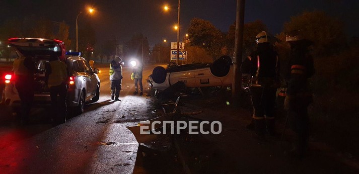 У Києві таксі влетіло у стовп і перекинулося на дах