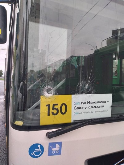 За 15 хвилин в іншому місці, але на цьому ж маршруті – на його кінцевій зупинці, вул. Милославській, – інший хлопець типової зовнішності, проходячи повз автобус, запустив камінь у лобове скло.