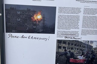 У Києві проти фотовиставки The War Is Not Over Yet («Війна ще не закінчилася») невідомі вчинили акт вандалізму з поширенням тез російської пропаганди, запереченням агресії Росії проти України та зневажливого ставлення до українських журналістів. Про це розповідає Інститут масової інформації.