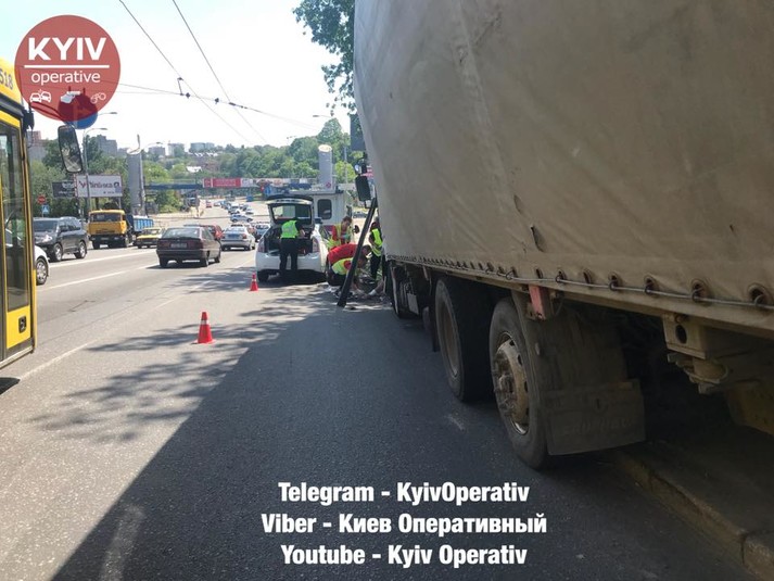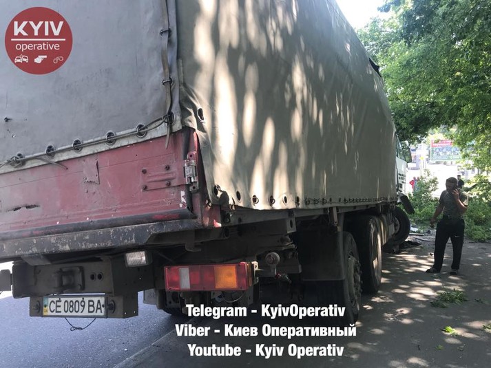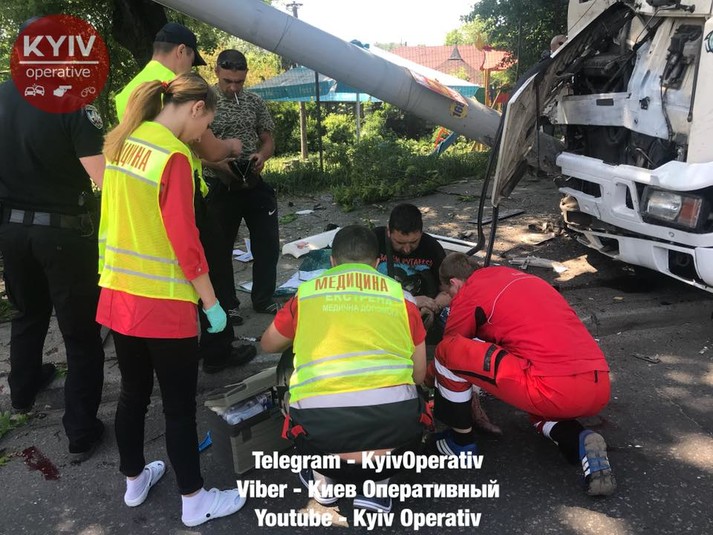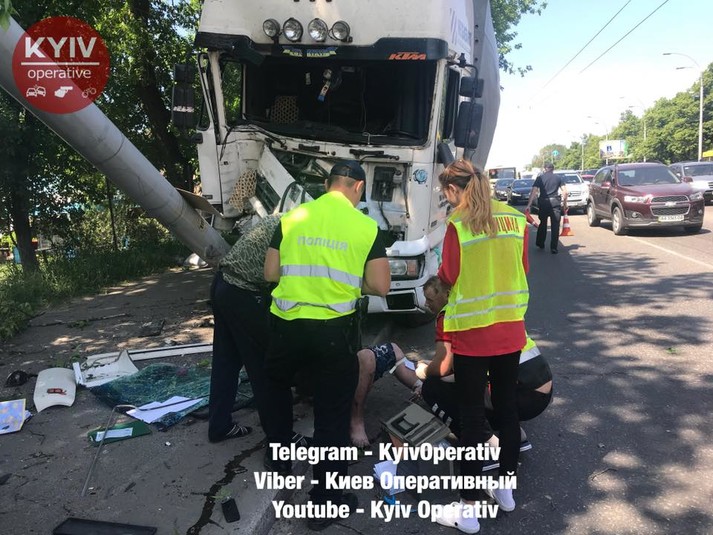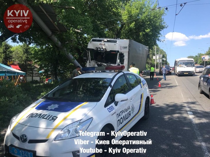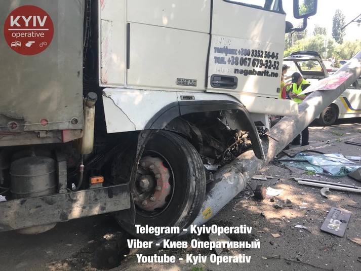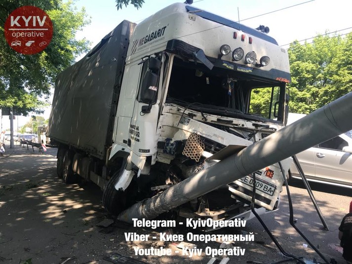 За даними видання, аварія сталася близько 12:10 на спуску проспекту Лобановського. Водій вантажівки зніс стовп і залетів на тротуар.