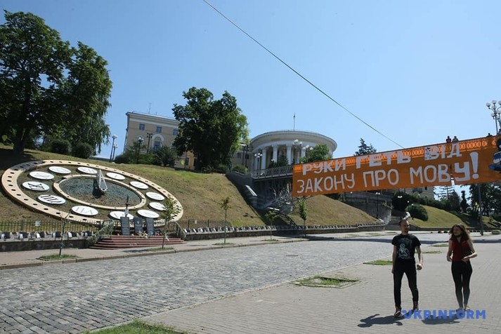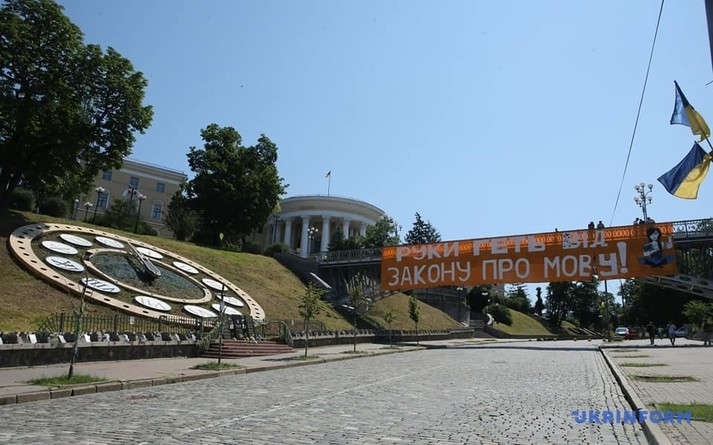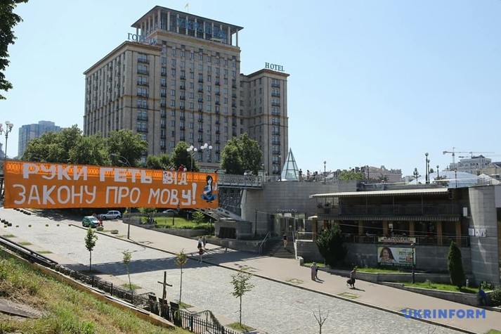 У День Конституції України у Києві на мосту над Алеєю Героїв Небесної Сотні активісти спільноти «Мова об’єднує» вивісили 25-метровий банер «Руки геть від закону про мову!».
