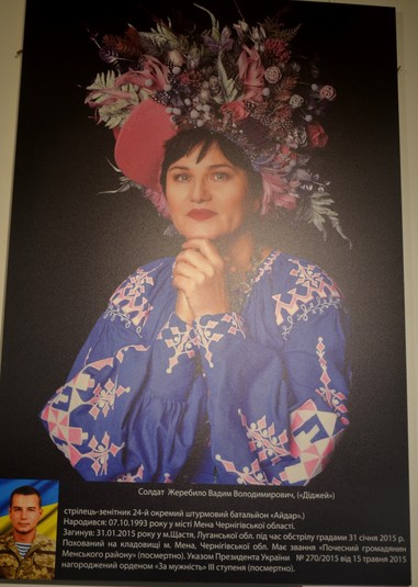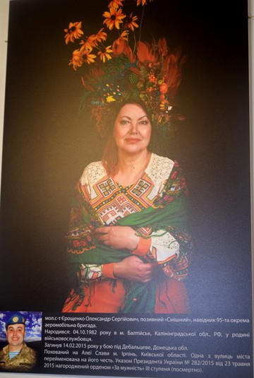 Одна з героїнь виставки - Тетяна Тороповська з Києва. Її син Георгій загинув у вересні 2014 року. Указом президента України нагороджений орденом «За мужність» ІІІ ступеня (посмертно). Пані Тетяна — кандидат історичних наук. Раніше викладала у столичних вишах, а після смерті єдиного сина — народила двійнят. Горе її не зламало. Зараз виховує своїх кровинок. Для жінки її малята - справжня втіха, яка дає можливість жити і зберігати світлу пам’ять про сина-захисника.