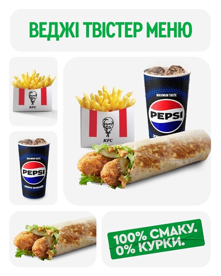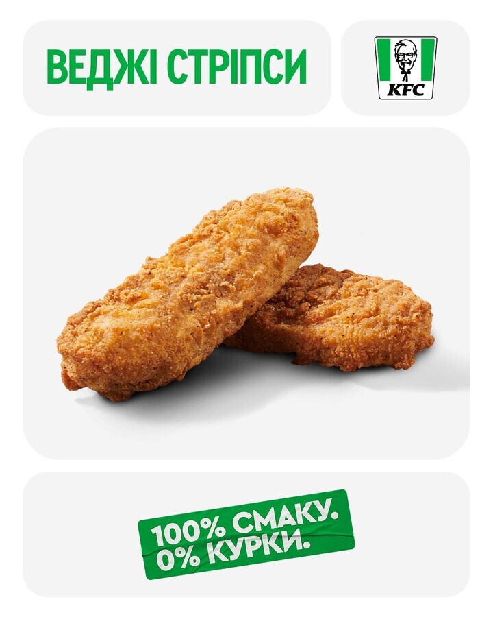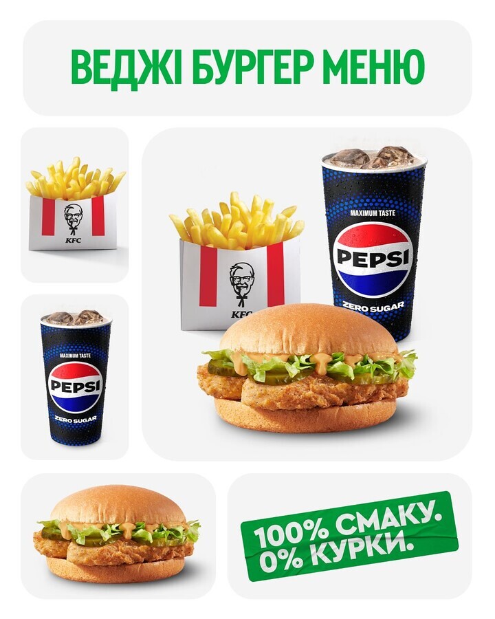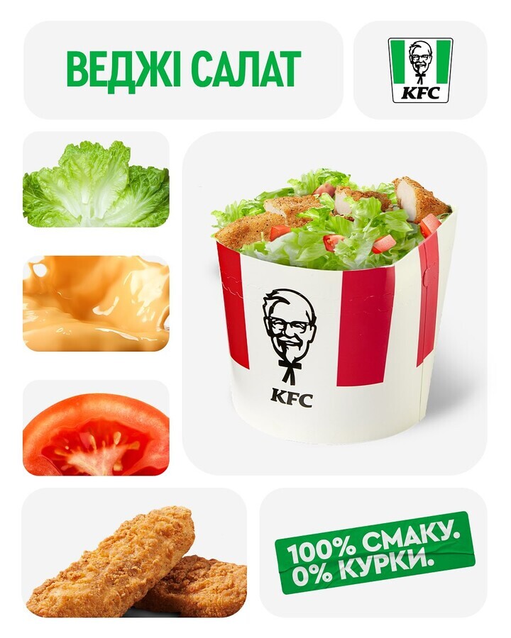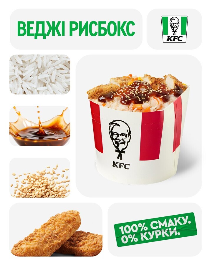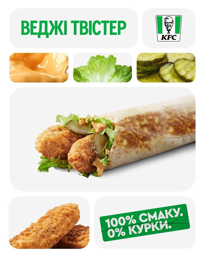 У меню – адаптовані класичні страви KFC, як-от «Веджі бургер» і «Веджі твістер», а також нові позиції, зокрема рисбокс із веджі-стрипсами та салати.