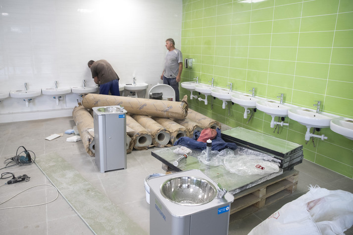 Наразі на об'єкті завершують ремонтні роботи, встановлюють сантехніку, а також обладнання в спортивних залах, актовому залі, тривають роботи з благоустрою території. Сьогодні на об‘єкті працює понад 300 фахівців.