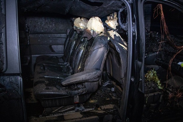 Полум'я охопило передню частину автомобіля. У мінівена вигоріла кабіна водія, а ось пасажирська частина не встигла загорітися, але обвуглилася. Пожежно-рятувальна служба оперативно загасила вогонь. Інших машин поблизу не було, тому пожежа торкнулася тільки Mercedes.