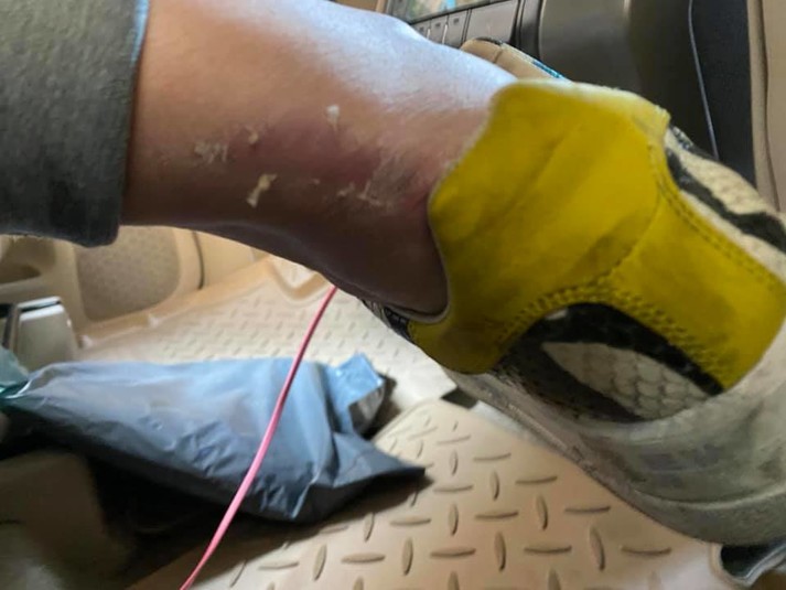 «А це норм – така поведінка на дорогах? Вважайте це заявою, хотілося б знати – чия машина. Чорний слід на джинсах – від колеса. Потоки стояли або рухалися дуже повільно. Водій не міг не бачити мене та інспектора», – написала Влащенко.