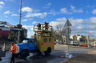 Фахівці відновлюють контактну мережу, щоб запустити рух тролейбусів.