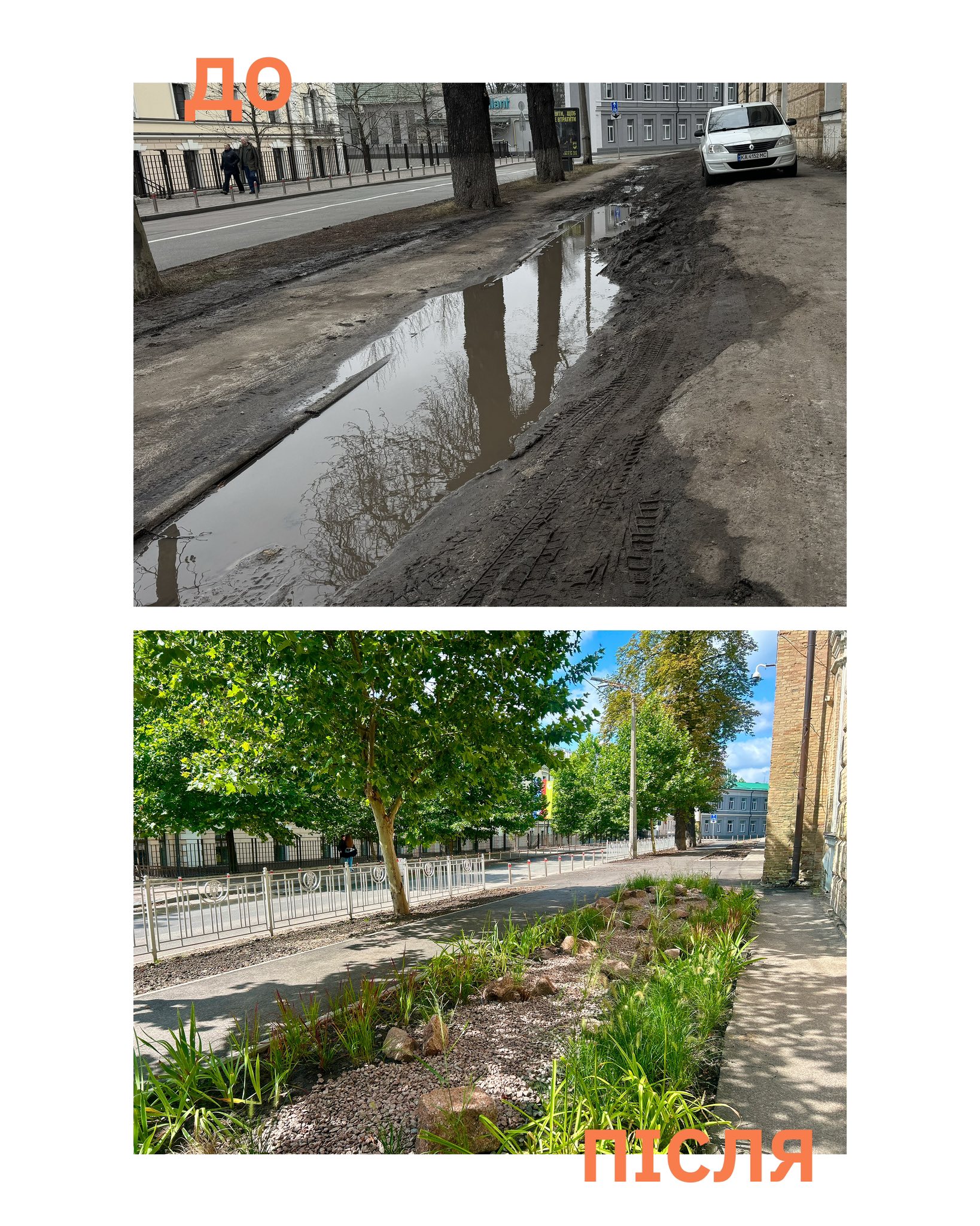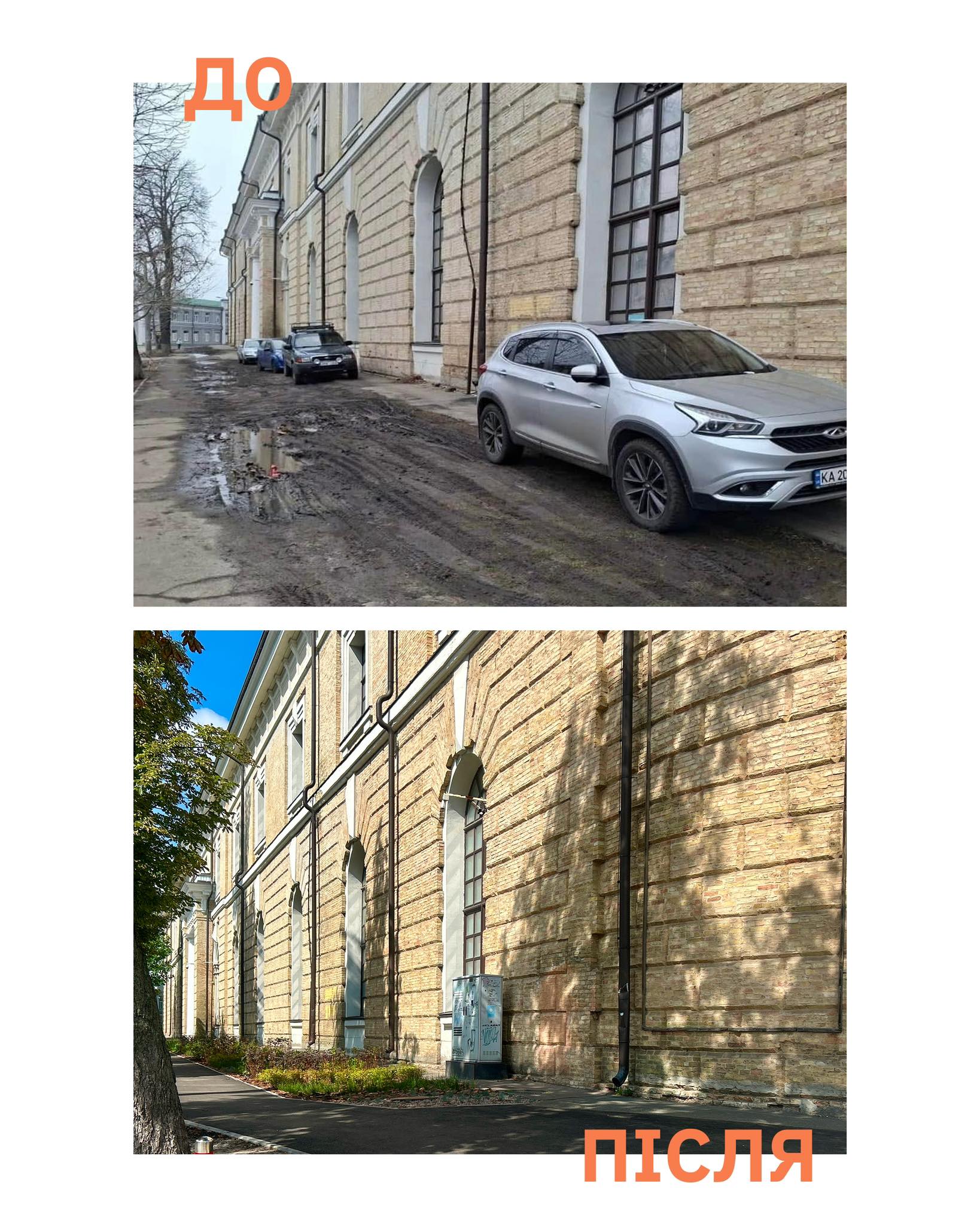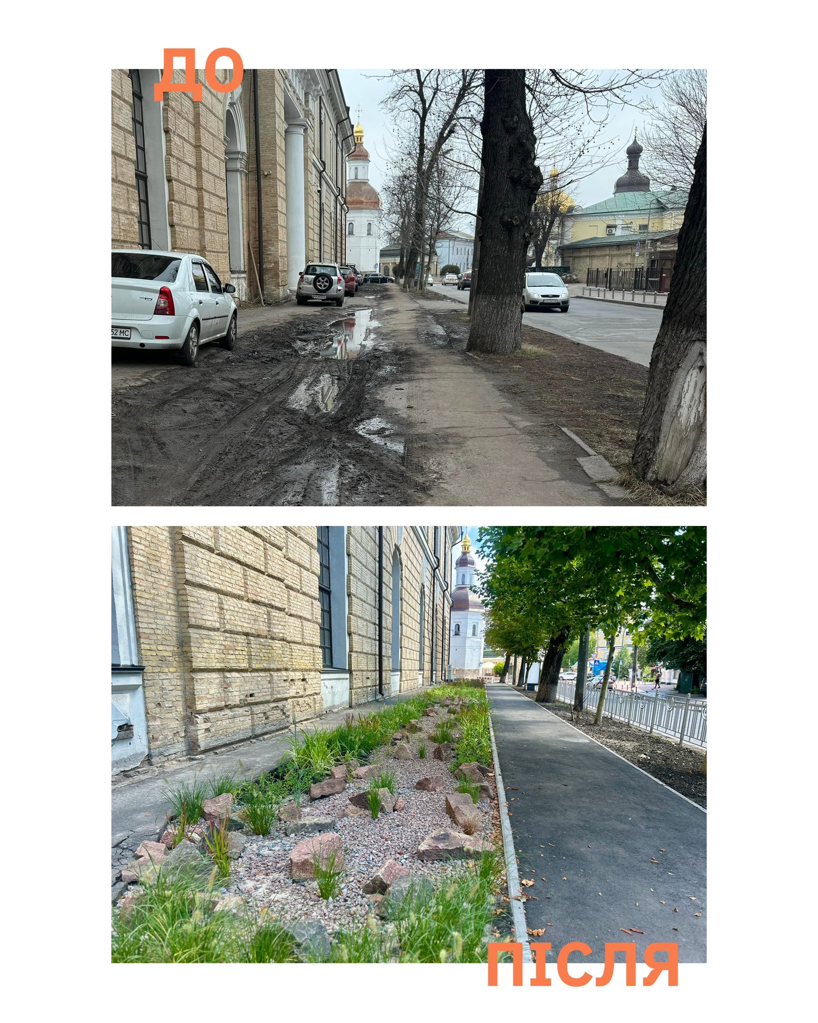 - облаштовано зелені зони та клумби замість колій від шин, які раніше псували газони.