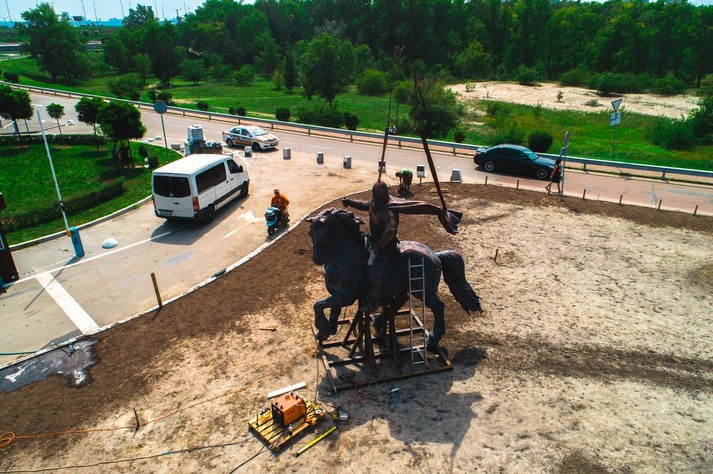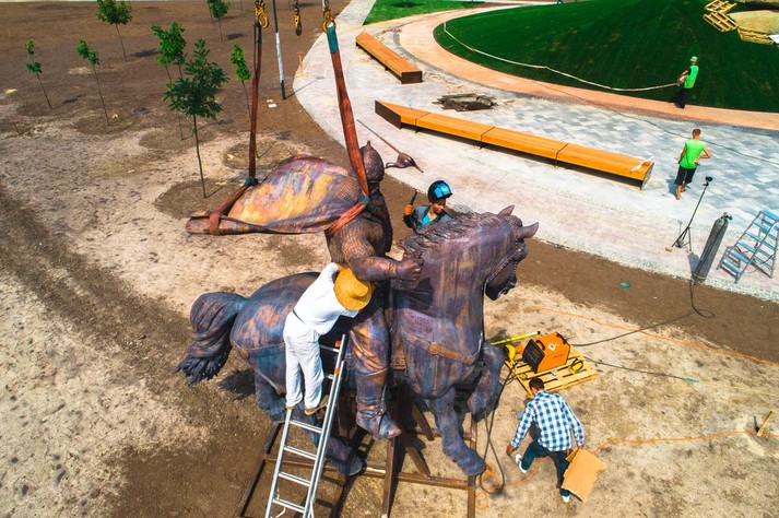 Важить такий богатир дві тонни. Висота композиції з постаментом - 11 метрів. Інформаторспостерігав за процесом встановлення скульптури.