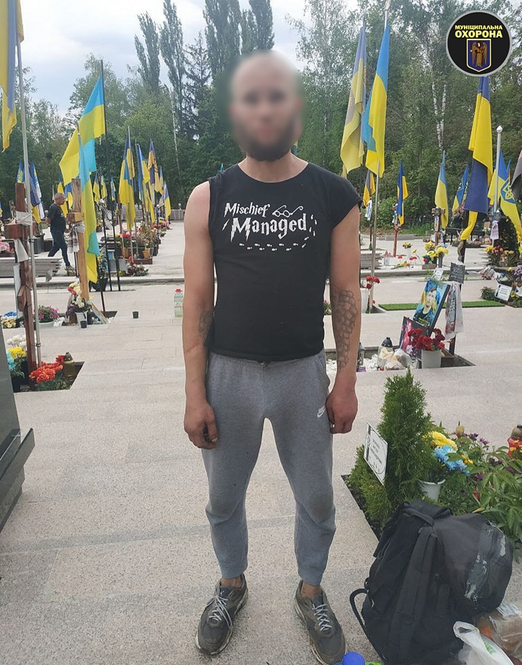 «Під час патрулювання на вулиці Стеценка працівники комунальної організації «Муніципальна охорона» помітили чоловіка, який ходив між могилами загиблих героїв і забирав речі – дитячі іграшки, шеврони, їжу», – йдеться у повідомленні.