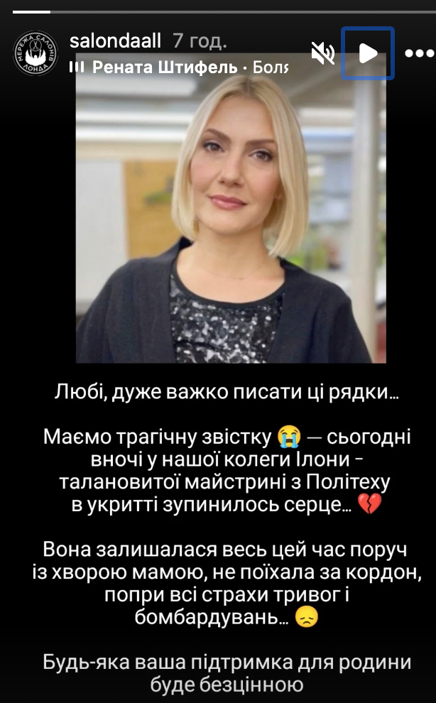Згодом стало відомо, що російська атака забрала життя київської перукарки Ілони Ревут. За повідомленням закладу, Ілона залишалася у столиці, доглядаючи хвору матір, і перебувала в укритті під час обстрілів. Серце 52-річної жінки не витримало стресу.