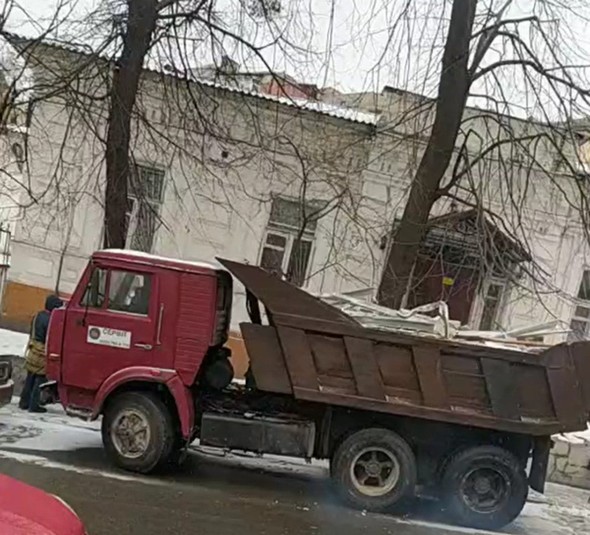 На відео видно, як кілька чоловіків виносять з будівлі якісь предмети і вантажать на припаркований біля входу КамАЗ.