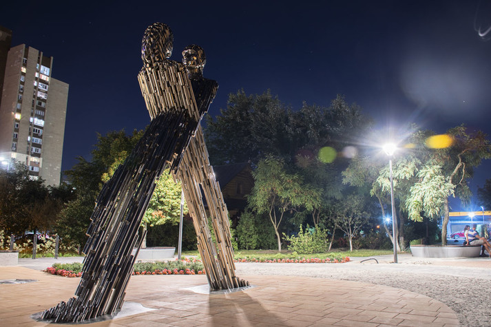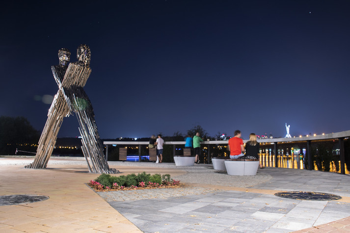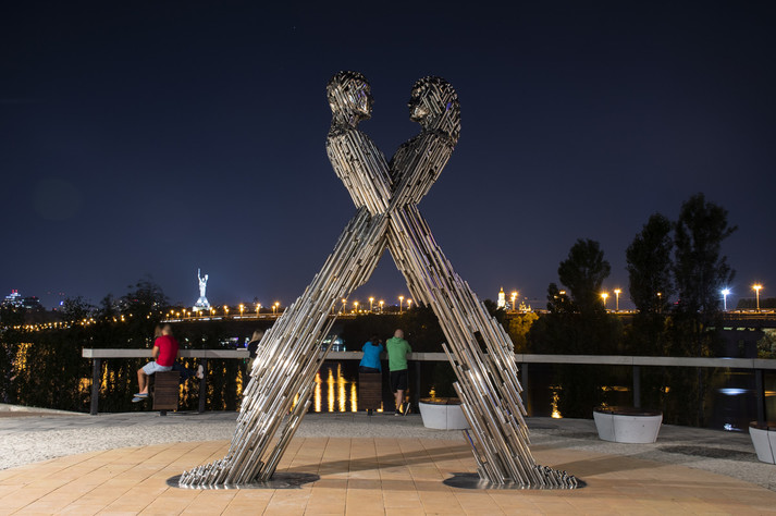 На Дніпровській набережній у Києві з'явилася унікальна скульптура, яка символізує жіноче і чоловіче начало. Найкраще на об'єкт дивитися під час заходу сонця. Саме в цей час промені сонця проходять через скульптуру.