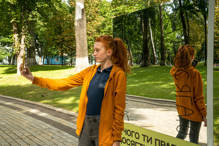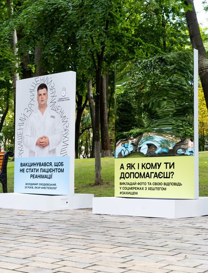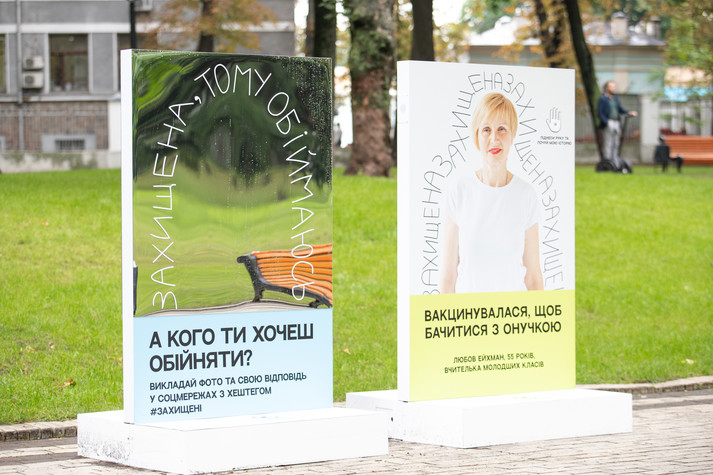 Інсталяція «Захищені» у Маріїнському парку (вул. Грушевського) – це стенди з фотографіями щеплених від Covid-19 українців, які вакцинувалися, щоб жити, щоб не стати пацієнтом реанімації, щоб бачитися з онуками, щоб знову подорожувати. Щоб послухати історії цих українців, достатньо просто підняти руку і стенди, обладнані датчиками руху, «заговорять» їхніми голосами. У парку також розміщені ідентичні дзеркальні стенди, за допомогою яких можна зробити селфі та викласти їх у соцмережі разом із власною розповіддю, що саме спонукало вас вакцинуватися.