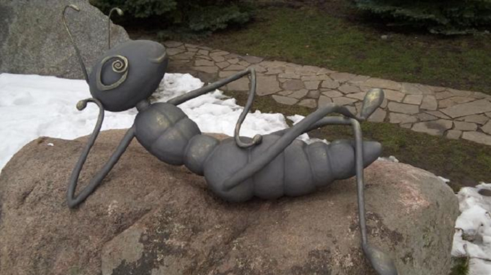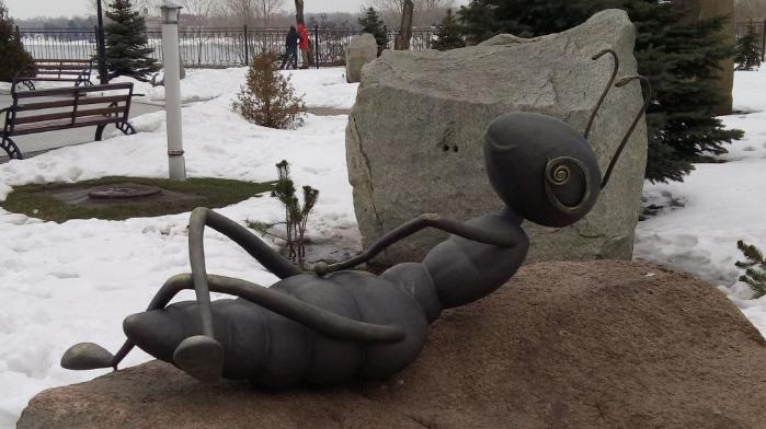 На Оболоні в Саду каменів встановлена скульптура мурашки, яка відпочиває на камені.