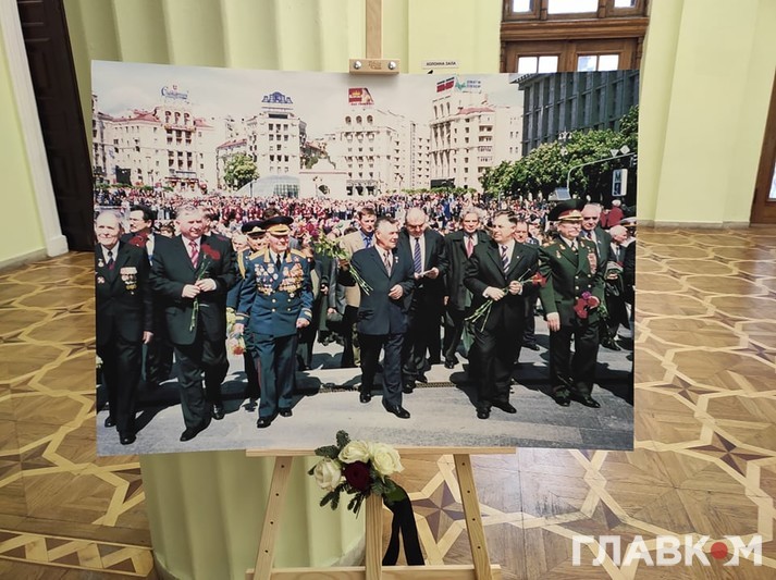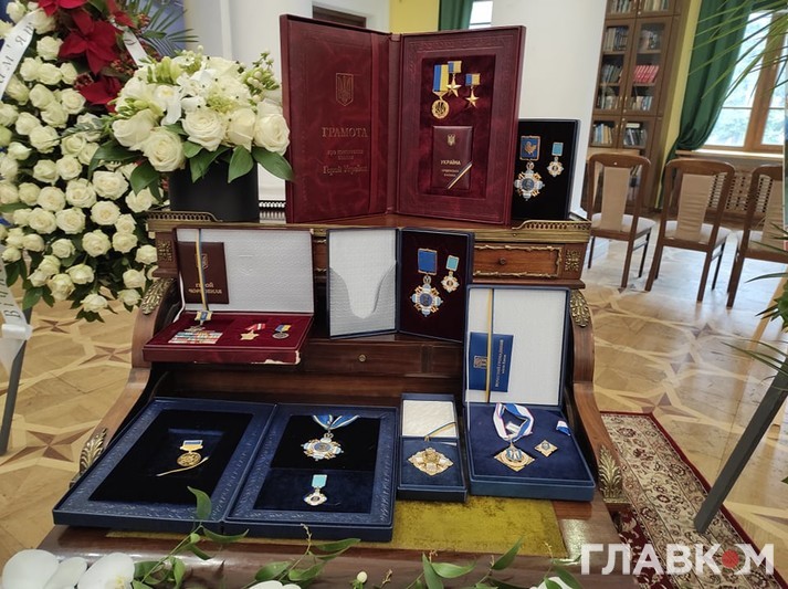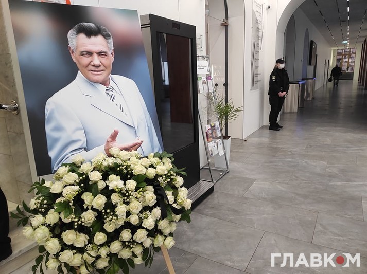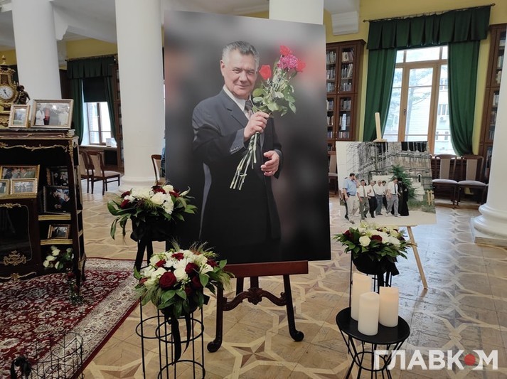 Як повідомляє кореспондент «Главкома», зала прикрашена безліччю квітів. Також тут облаштували фотовиставку про життєвий шлях Омельченка.