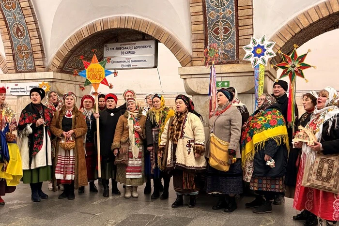Сьогодні, 25 грудня, спільнота «Київська коляда» традіційно заспівала колядки на станції метро «Золоті ворота» та привітала пасажирів столичної підземки із зимовими святами. Про це повідомляє кореспондент «Главкома».