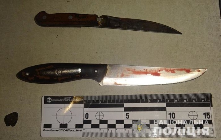 Як розповів начальник слідчого відділення Голосіївського управління поліції Олег Самойлик, з місця події вилучено речові докази, серед них два ножі, які відправлено на експертизу.