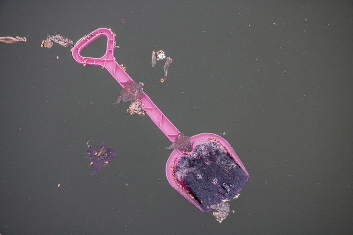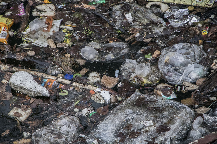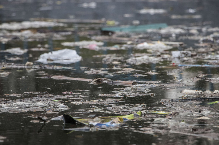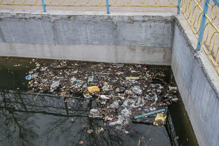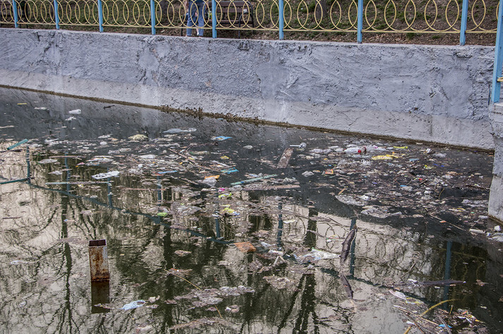 На поверхні води плавають пляшки, поліетилен та інше сміття