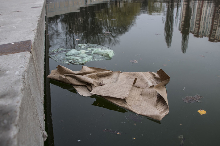 Водоймище у центрі парку «Орлятко» Солом'янського району знаходиться в украй плачевному стані. На поверхні плавають пляшки, поліетилен і залишки їжі.