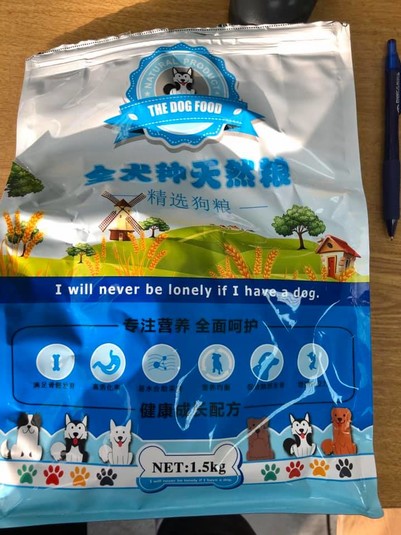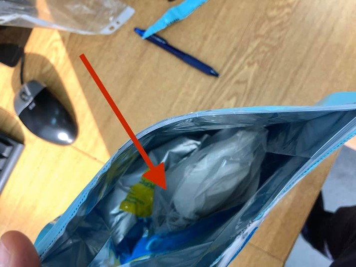 Під час огляду відправлення митниками було виявлено два металізовані пакети з-під собачого корму з порошкоподібною речовиною білого кольору.