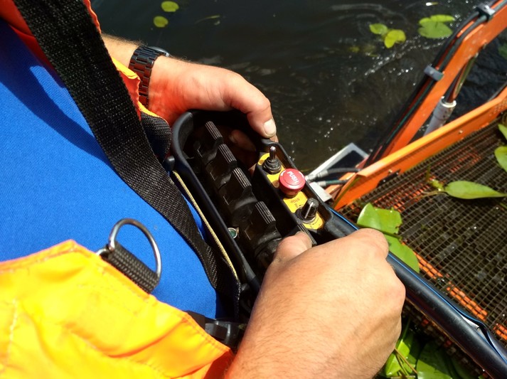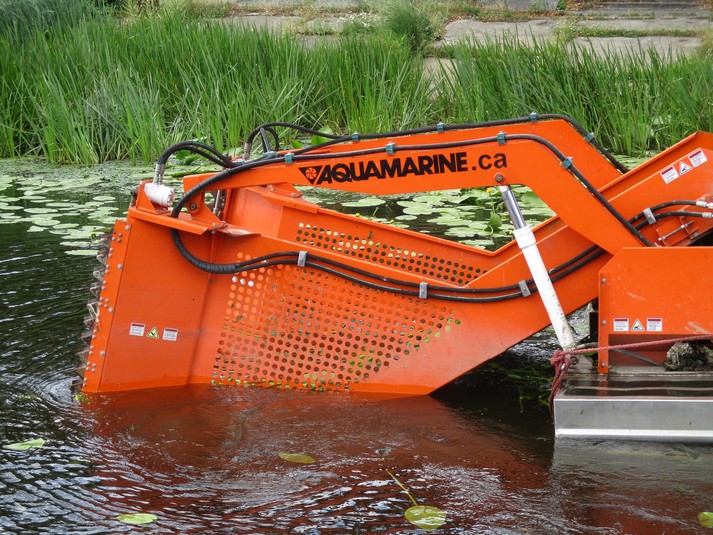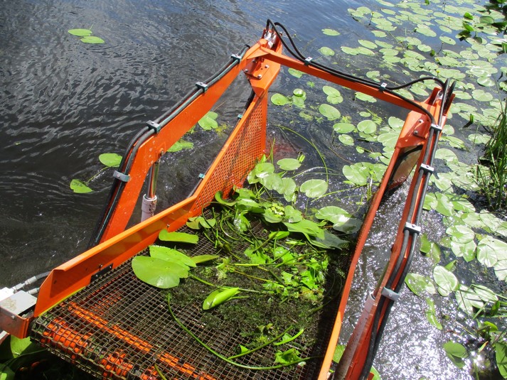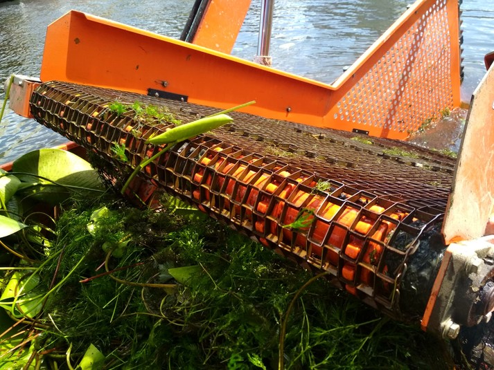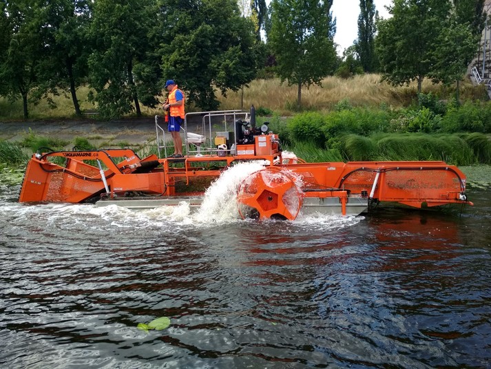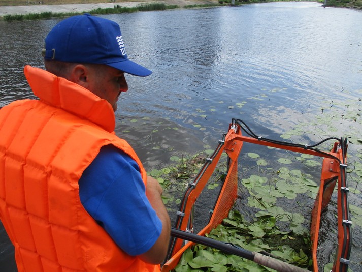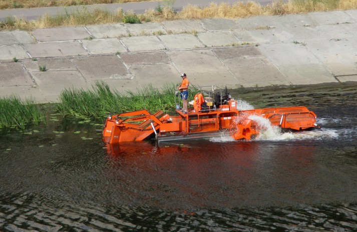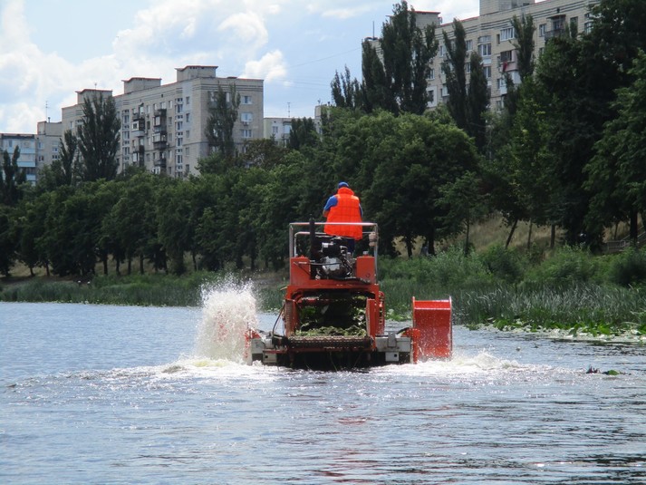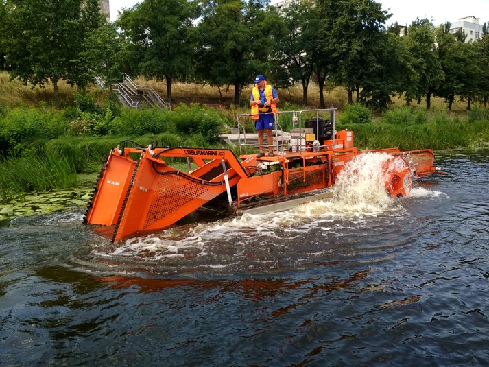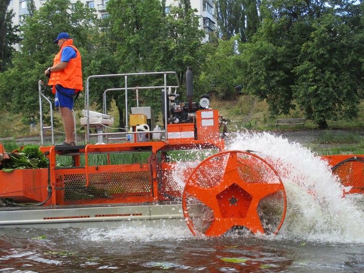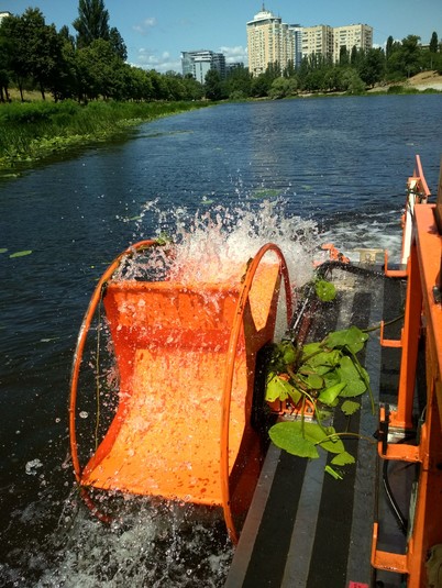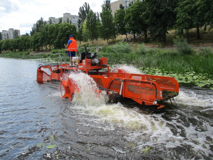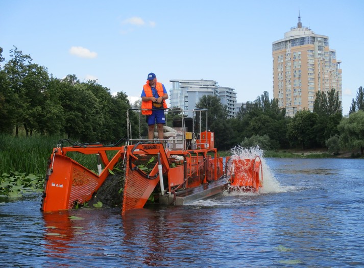 Машина довжиною 10 м і вагою 3 тонни призначена для скошування водної рослинності та прибирання плаваючого сміття.