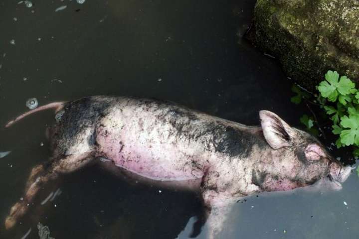 У селі під Києвом нестерпний сморід: фермери скидають дохлих свиней у воду (відео)