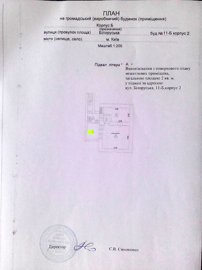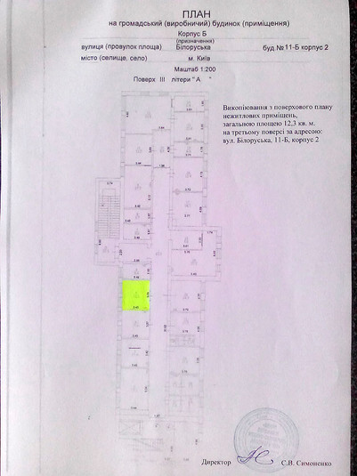 Шевченківська районна в місті Києві державна адміністрація має намір передати в оренду нежитлові приміщення на вул. Білоруська, 11-Б, корпус 2, загальною площею 14,3 кв.м: підвал – 2,0 кв.м, цільове використання - інше використання нерухомого майна (розміщення генератора безперебійного електричного живлення); 3-ій поверх – 12,3 кв.м, цільове використання – під офіс. Строк оренди 2 роки 364 дні. Вартість об’єкта оренди 281 000,00 грн без ПДВ. Орендна ставка 15%. Орендна плата 3698,65 грн без ПДВ (коригується на індекс інфляції).