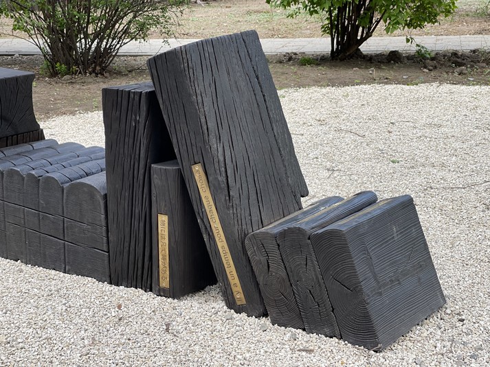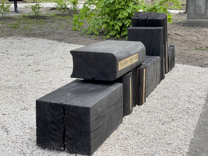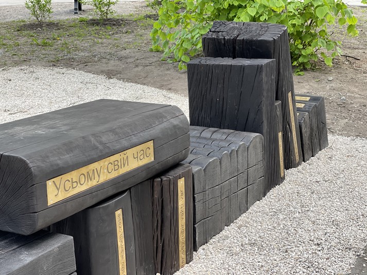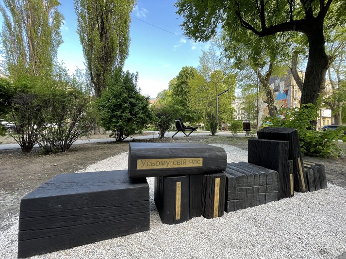 У Сквері київських інтелігентів, що на перетині вулиць Гончара й Велика Житомирська в Києві, з’явилась арт-інсталяція у вигляді лави «Усьому свій час».