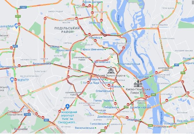На виїздах з міста рух заблоковано на проспекті Перемоги у бік виїзду зі столиці. Також затор утворився на Великій кільцевій дорозі. У районі розв'язки біля станції метро «Теремки» також спостерігається скупчення транспорту, так само як і в районі Харківської площі (біля станції метро «Бориспільська»). Сервіс Google Maps свідчить про десятки дорожніх аварій в різних частинах міста. ДТП зафіксували біля мосту Патона (на правому березі), вулицях Антоновича, Довженка, Борщагівській, Оболонській, Кирилівській, Полярній, Богатирській; проспектах Голосіївському, Перемоги, Повітрофлотському, Броварському, Тичини; Вознесенському узвозі та багатьох інших магістралях.