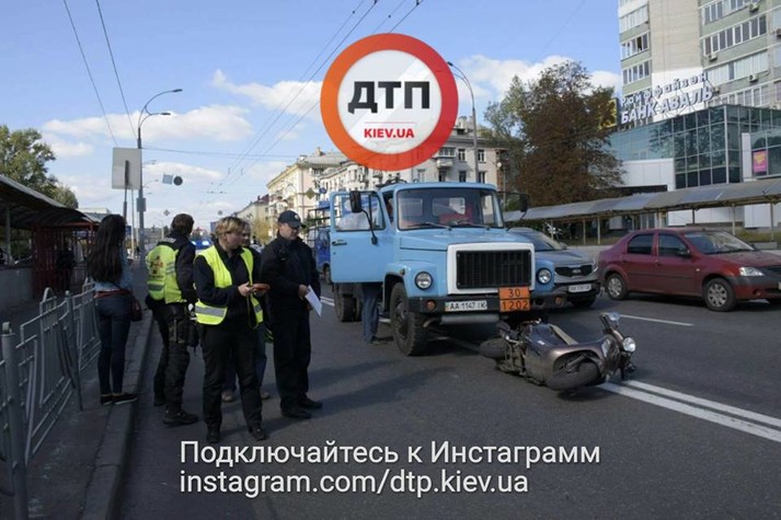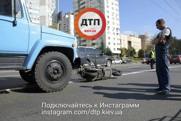 Сьогодні, 27 вересня, на проспекті Лобановського, 4а вантажівка збила водія скутера. Аварія сталася біля зупинки громадського транспорту.