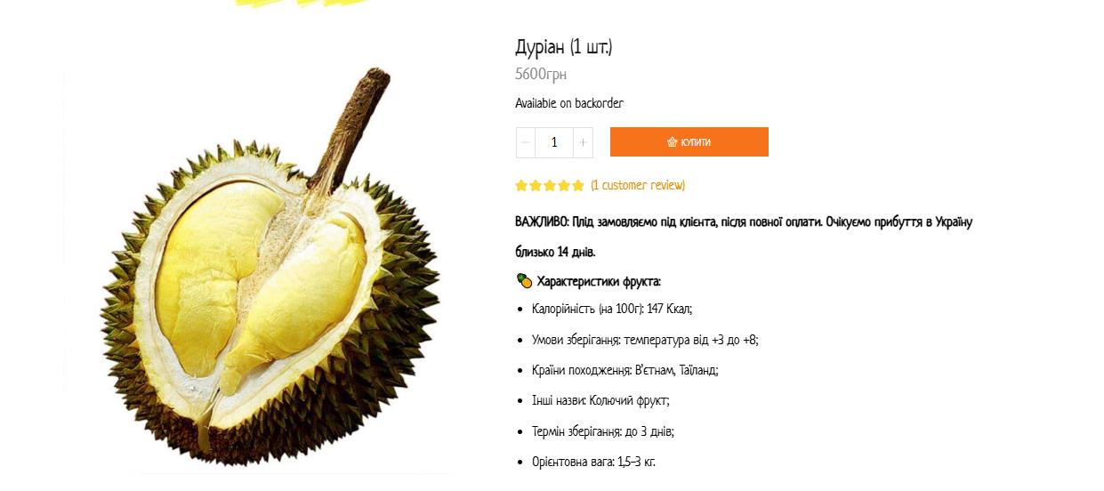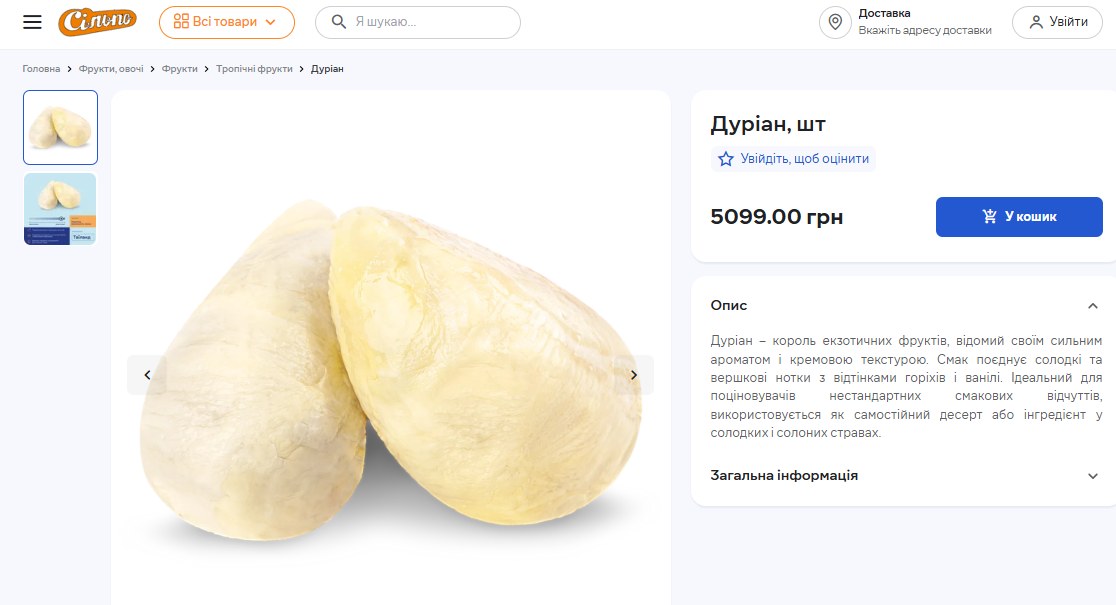 5099 грн – це не остаточна ціна за короля фруктів, Зокрема, на одному з сайтів його пропонують привезти безпосередньо від покупця з повною попередньою оплатою за 5,6 тис. грн. Чекати доведеться два тижні.