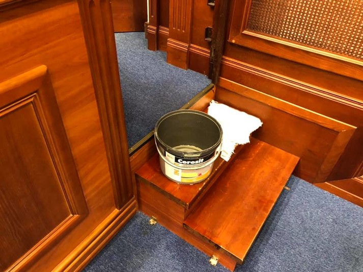 Депутат оприлюднив фото зі столичної мерії. На них видно, що біля входу до зали засідань Київради стоїть відро, куди зі стелі капає вода. Поруч з відром лежить ганчірка.